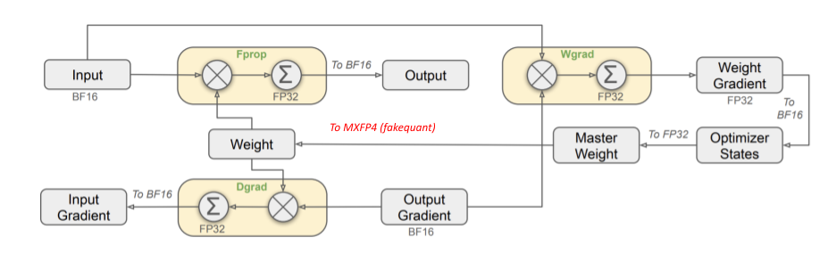 QAT is specifically designed to recover accuracy for the inference stage, so there is no need to quantize gradients. With gradients remaining in full precision, the two backward GEMMs—Wgrad and Dgrad—are computed in high precision rather than low precision. As in native quantized training, FP32 master weights are maintained to ensure stable convergence.