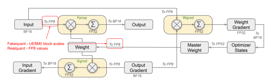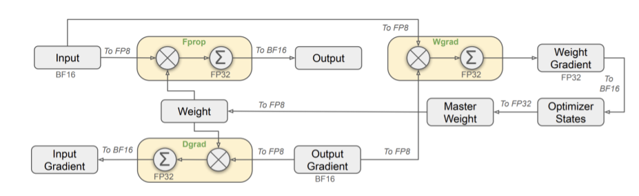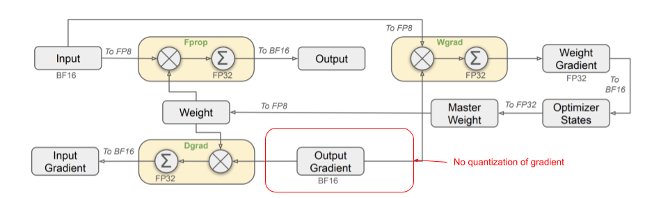 The following illustration, from the DeepSeek V3 tech report, demonstrates FP8 native quantized training. The core idea is to quantize three GEMMs — Fprop, Wgrad, and Dgrad. To perform these GEMMs in low precision, all three of their inputs — Input (activation), Weight, and Output Gradient — must be quantized to FP8.